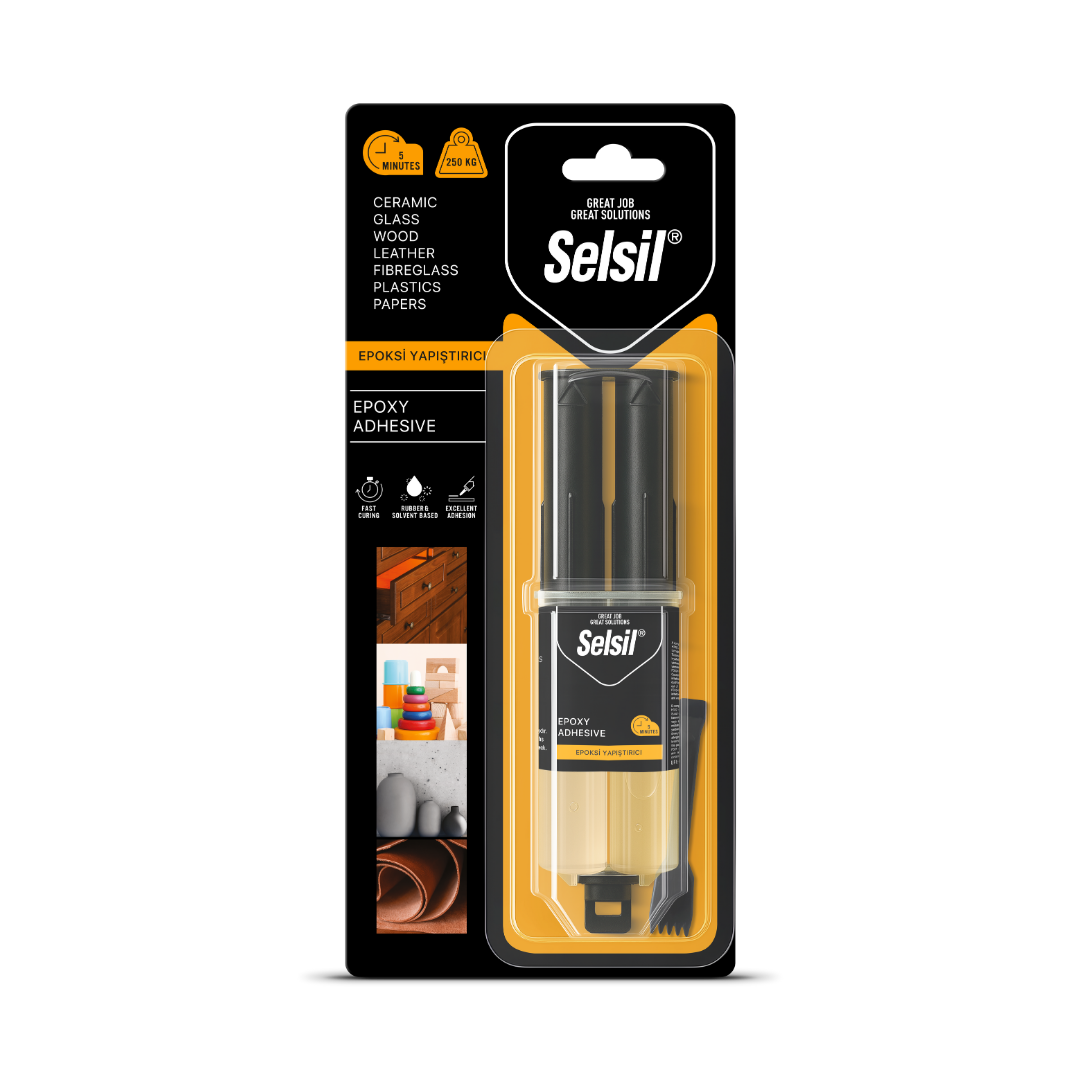Selsil Epoksi Yapıştırıcı 5 dakika, hızlı sertleşen, epoksi reçine ve sertleştiriciden oluşan çift komponentli bir yapıştırıcıdır.